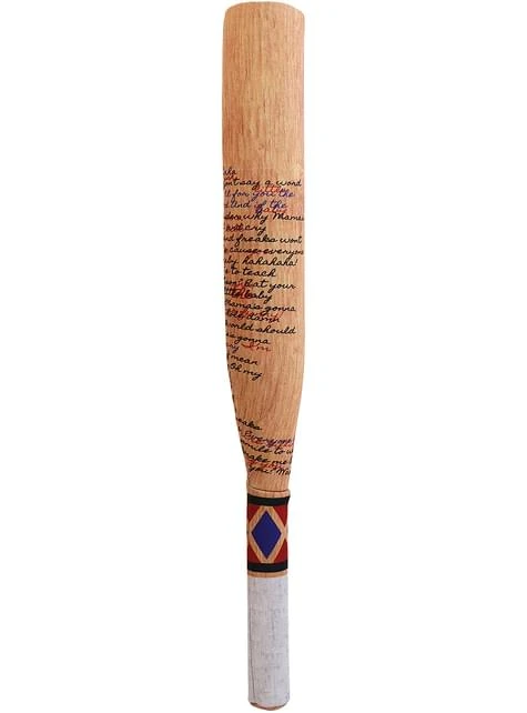 Y es que la psicópata de Harley no lleva las típicas armas tradicionales de cualquier villano. Y el bate de Harley tampoco es el típico bate de béisbol. Ella lo lleva decorado con su propio estilo. Con las palabras «Good Night» grabadas en él y una «original» poesía que pondría los pelos de punta a cualquiera. Además, en el mango de propio bate, se encuentran los característicos rombos de arlequín de Harley Quinn.