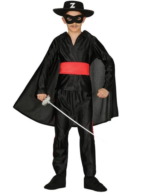 Este legendario disfraz de héroe enmascarado incluye una camisa con capa negra como la del Zorro, pantalón negro, antifaz negro y fajín rojo.