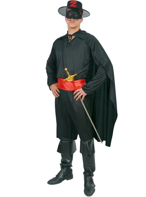 Incluye una camisa negra, unos pantalones negros, un fajín rojo, un antifaz negro y una capa negra.