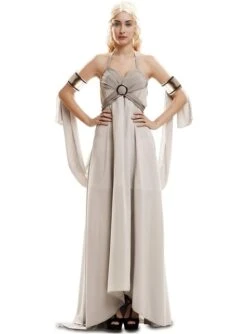 Este disfraz de Khaleesi está compuesto por un precioso vestido beige con escote gris cruzado con el que tantas veces hemos visto a Daenerys Targaryen. Es un vestido largo con un corte similar al griego y con dos brazaletes plateados para los brazos. Un vestidazo con el que podrás dejar a todos boquiabiertos en cualquier fiesta de disfraces.