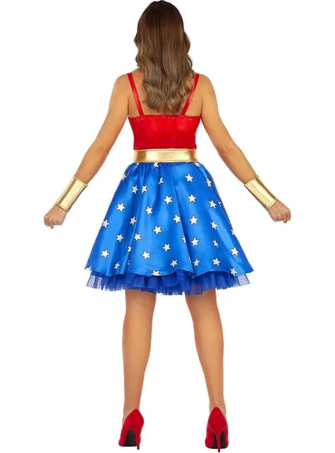 Este clásico disfraz de Wonder Woman incluye una falda azul con vuelo y tul con la parte superior de tirantes y en color rojo y el símbolo de Wonder Woman (una «W») bordado en color dorado. Además, incorpora un cinturón dorado, muñequeras a juego y, por supuesto, una tiara con la estrella roja que dará a tu look de superheroína el toque definitivo.
