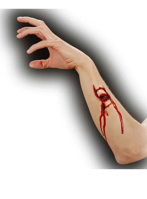 Incluye una prótesis de calidad profesional que recrea una fractura de hueso abierta para colocar en la piel y el pegamento para su aplicación.