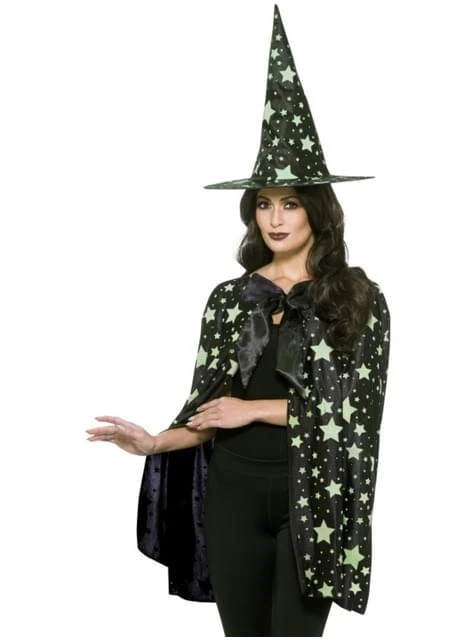 Incluye: capa y sombrero negros que brillan en la oscuridad