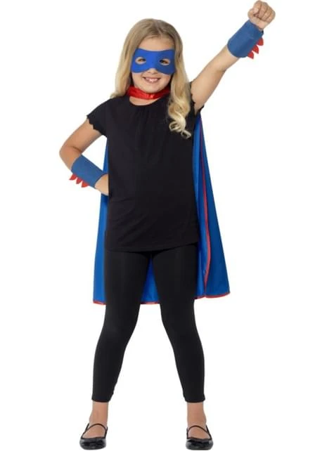 Incluye una capa color azul con un detalle de letras, un antifaz y un par de guantes color azul con detalles rojos.