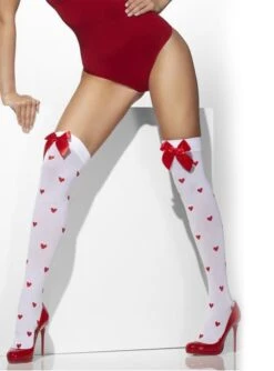 Incluye unas medias blancas hasta el muslo con corazones dibujados y dos lazos rojos.