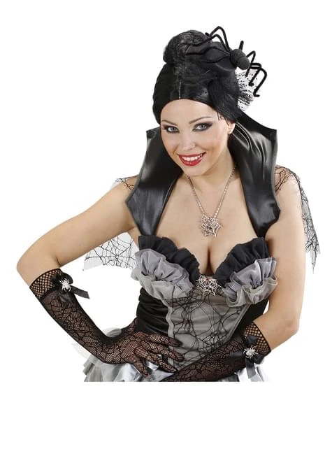 Incluye un mini sombrero negro con tela de malla con topos y encaje y una araña con ojos de piedra rojos. Tiene dos clips de pelo para sujetarlo de forma más cómoda a la cabeza.