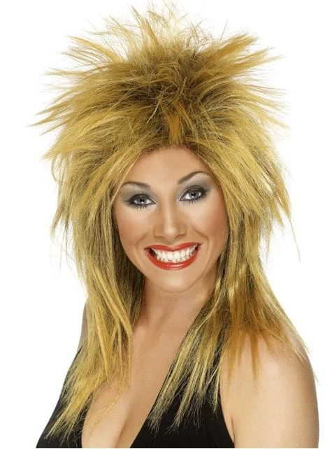 Incluye una peluca roquera de corte mullet rubia y negra.