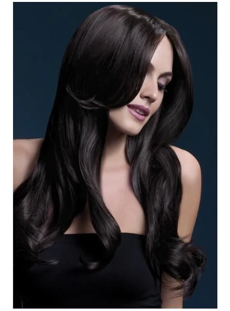 Incluye una peluca larga con ondas sueltas, 66 cm. con flequillo largo de color castaño.