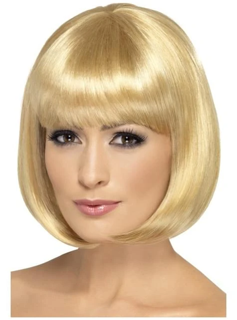 Incluye una peluca de corte bob con flequillo de color rubio oscuro.
