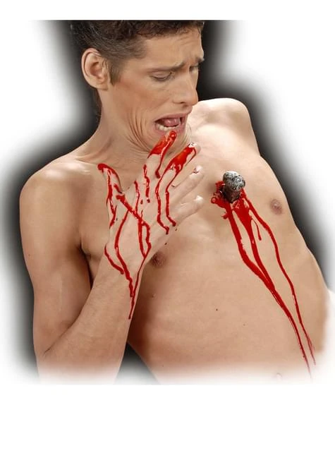 Incluye una prótesis de calidad profesional que recrea una perforación de clavo donde se ve el extremos saliente para colocar en la piel y el pegamento para su aplicación.