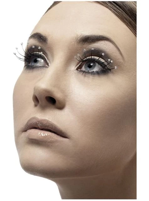 Incluye unas pestañas negras con gotitas y también contiene pegamento.