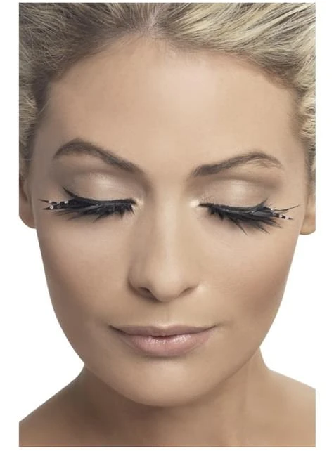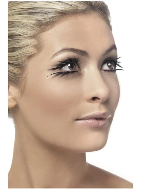 Incluye unas pestañas negras de parte inferior y superior con brillos y contiene pegamento.
