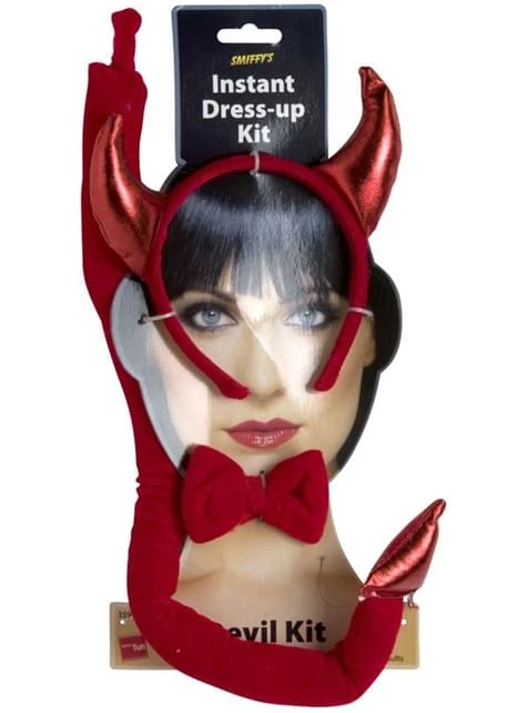 Incluye una diadema con cuernos, un tridente y una pajarita.