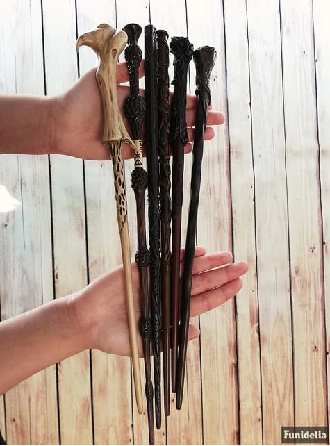 Incluye varita de 36 cm aproximadamente, fabricada en resina. Presentada en su estuche de coleccionista de la tienda Ollivanders.